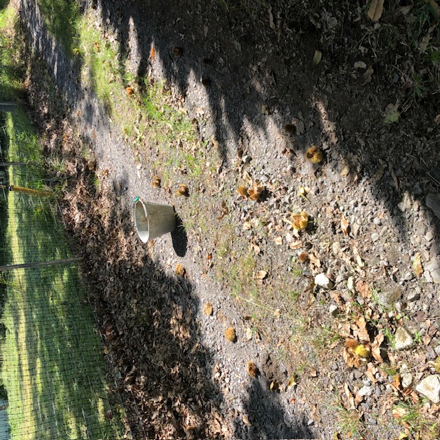 今朝はセーターを着ています。道路に落ちた栗は鹿の取り分です。今朝も鹿のグループが来ていましたが、残念でした・・・私が昨日の夕方ゲットした後でした。