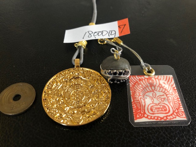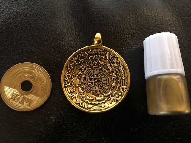 9,000円(税送料込み)・・・裏は凸で鏡になっており、ネガティブなエネルギーを跳ね返します。入魂済で直径3cm・・・サービス品のオイル(写真右)を一滴垂らしたまに磨くことにおいて、跳ね返す力がアップします。ゴールド色